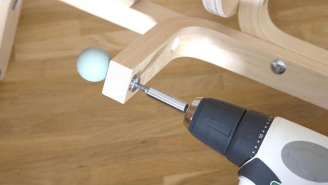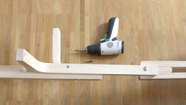 Für das Ablagetischchen, wird an einem der Hockerbeine nun die Sitzfläche festgeschraubt.