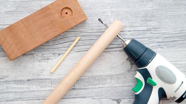 2. Für die Vasenaufhängung 1-2 Löcher mit dem Holzbohrer in das Rundholz bohren.
